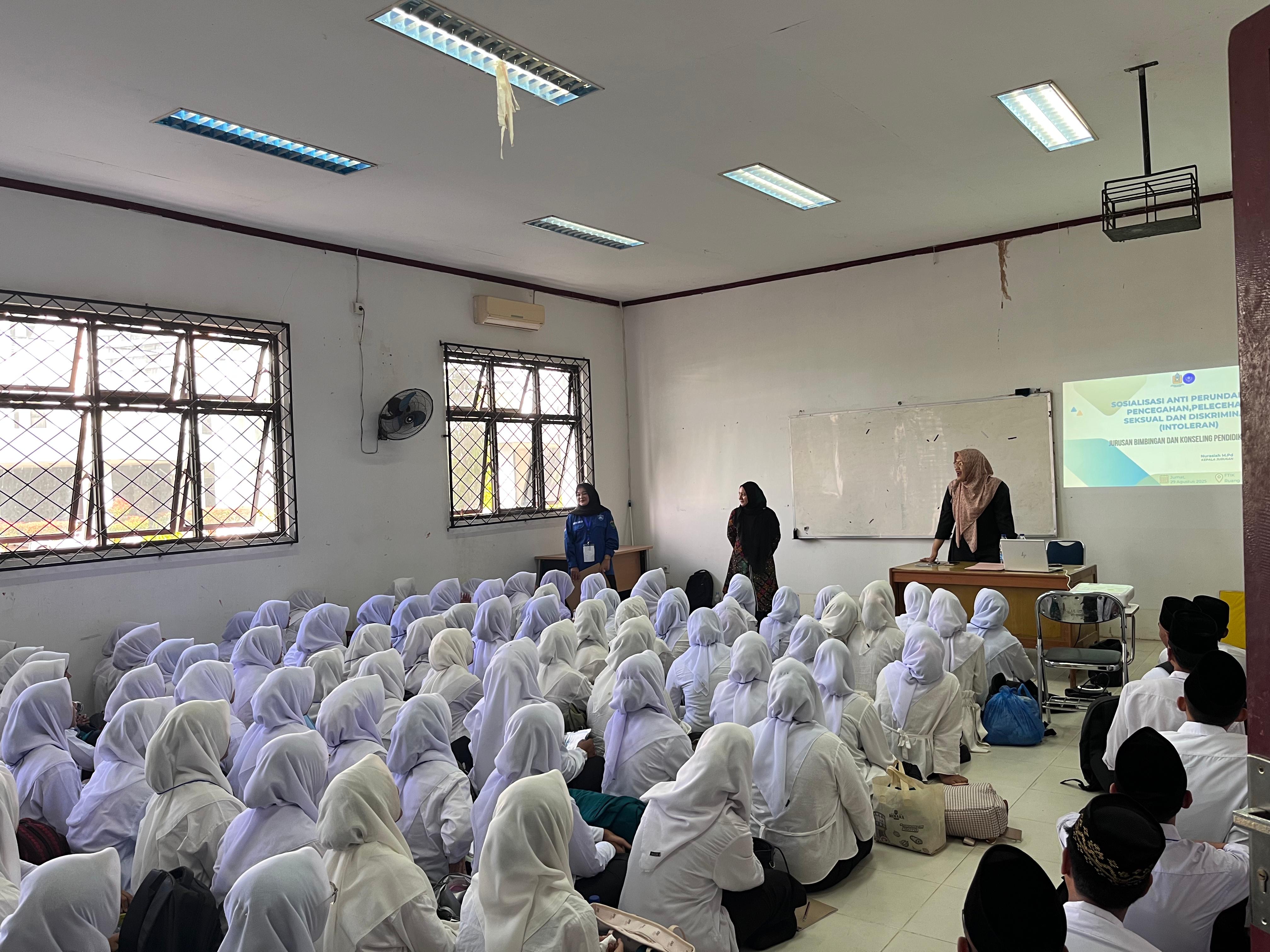 Jurusan Bimbingan dan Konseling Pendidikan Islam (BKPI) menyelenggarakan kegiatan sosialisasi pencegahan perundungan, kekerasan/pelecehan seksual, serta tindakan intoleransi sebagai upaya menciptakan lingkungan akademik yang aman, sehat, dan inklusif. Kegiatan ini menghadirkan pemateri dari kalangan akademisi dan praktisi layanan perlindungan kampus, yang memaparkan berbagai bentuk perilaku kekerasan, mekanisme pencegahan, hingga prosedur pelaporan resmi yang dapat diakses mahasiswa.