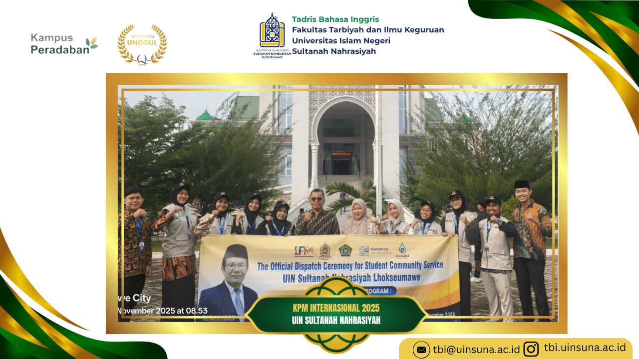 Lhokseumawe, 17 November 2025 — Universitas Islam Negeri (UIN) Sultanah Nahrasiyah Lhokseumawe resmi melepas keberangkatan 22 mahasiswa peserta Kuliah Pengabdian Masyarakat (KPM) Internasional Tahun 2025, termasuk empat mahasiswi dari Program Studi Tadris Bahasa Inggris (TBI): Natasya Quratul Ayuni, Rhanty Ayu Sarah, Zahwa Azyva, dan Nova Karina. Mereka akan melaksanakan pengabdian di Malaysia pada 13 November hingga 3 Desember 2025. Adapun penempatan pengabdian terbagi ke dua wilayah, yakni Zahwa Azyva dan Nova Karina di Pulau Pinang, serta Rhanty Ayu Sarah dan Natasya Quratul Ayuni di Malaka.