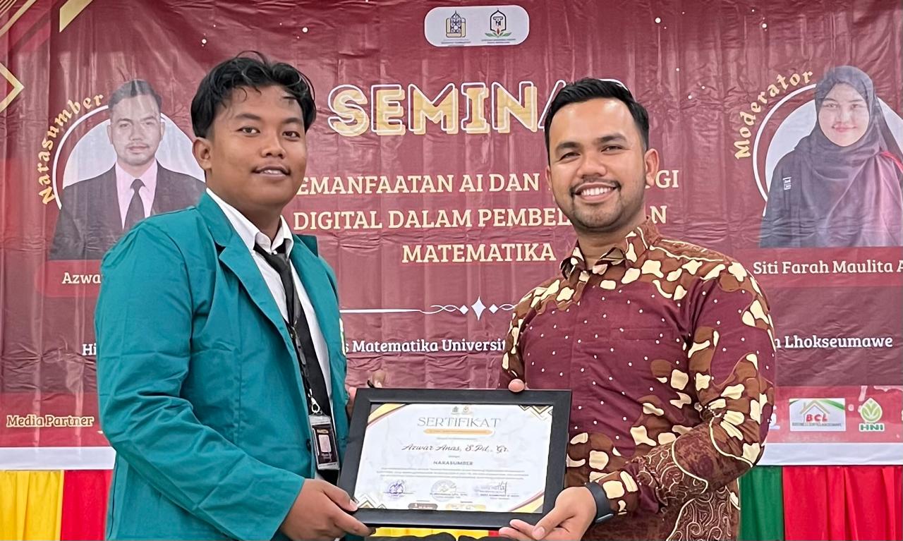 Lhokseumawe, 16 Oktober 2025 – Himpunan Mahasiswa Jurusan (HMJ) Tadris Matematika (TMA) Universitas Islam Negeri (UIN) Sultanah Nahrasiyah (SUNA) Lhokseumawe sukses menggelar Seminar dengan tema “Pemanfaatan AI dan Teknologi Digital dalam Pembelajaran Matematika” di Aula Fakultas Tarbiyah dan Ilmu Keguruan (FTIK).