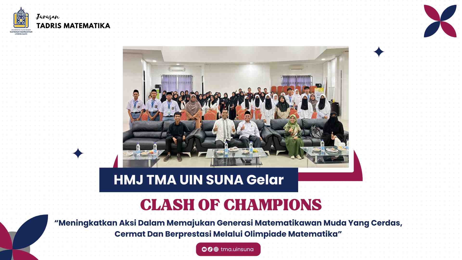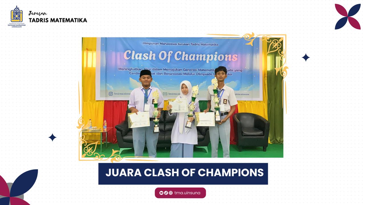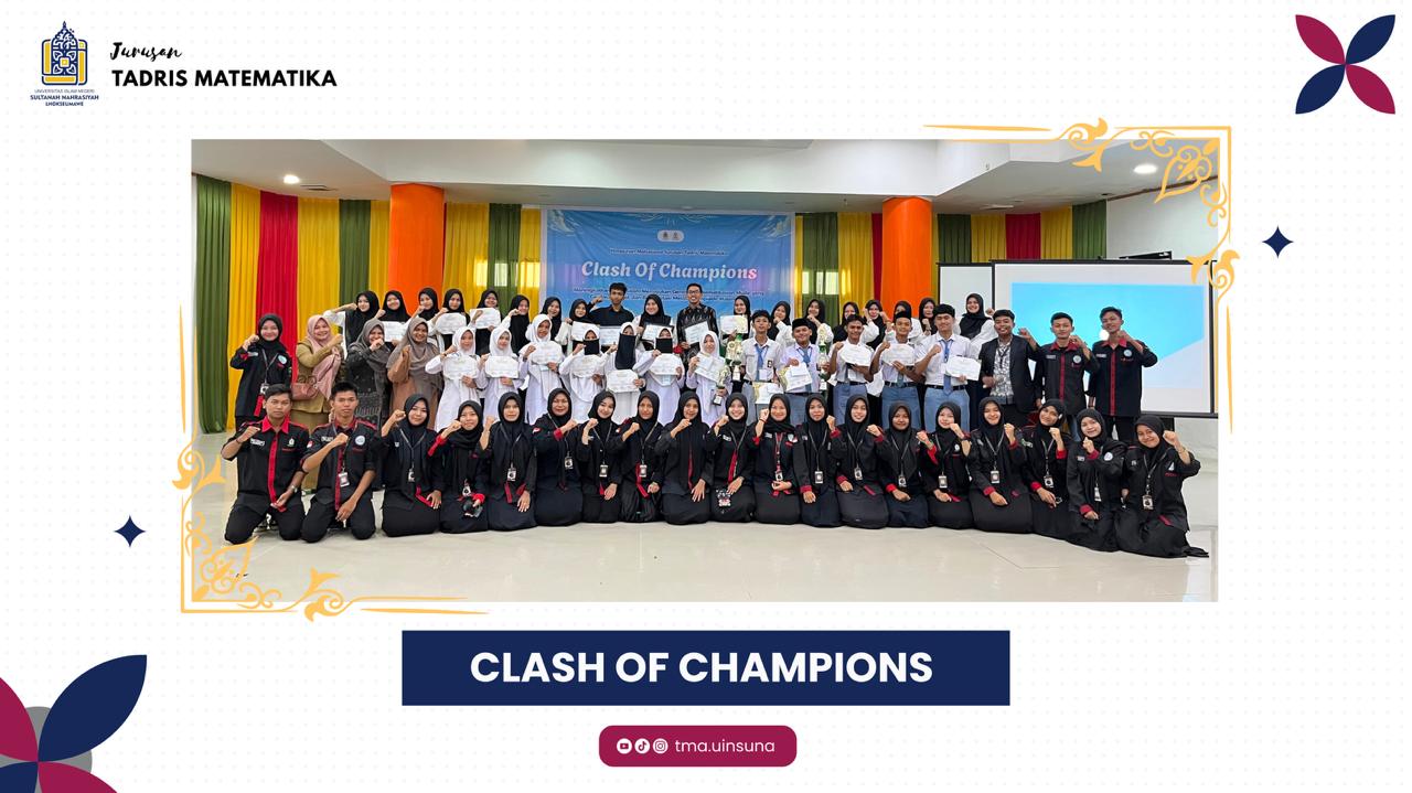 Lhokseumawe, 11 November 2025 - Himpunan Mahasiswa Jurusan Tadris Matematika (HMJ TMA) Fakultas Tarbiyah dan Ilmu Keguruan (FTIK) UIN Sultanah Nahrasiyah Lhokseumawe sukses menggelar lomba Clash of Champions (COC) yang diikuti oleh 30 peserta dari SMA, MA, dan MAS se-Lhokseumawe dan sekitarnya. Dengan mengusung tema, "Meningkatkan Aksi dalam Memajukan Generasi Matematikawan Muda yang Cerdas, Cermat dan Berprestasi Melalui Olimpiade Matematika". Kegiatan berlangsung di Aula Fakultas Tarbiyah dan Ilmu Keguruan (FTIK) UIN Sultanah Nahrasiyah Lhokseumawe.