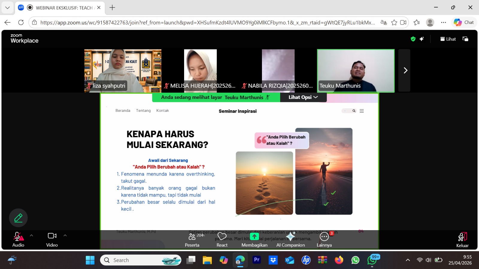 Lhokseumawe. Sabtu, 25 April 2026. Kegiatan Teach and Inspire Series 1 sukses digelar sebagai kolaborasi perdana antara PRODI PGMI (SUARASA) dan HMJ PGMI. “Mengusung tema Membangun Kemandirian Belajar Mahasiswa untuk PencapaianAkademik dan Pengembangan Diri yang Optimal serta Berkelanjutan”, kegiatan ini mendapat antusiasme tinggi dari peserta.