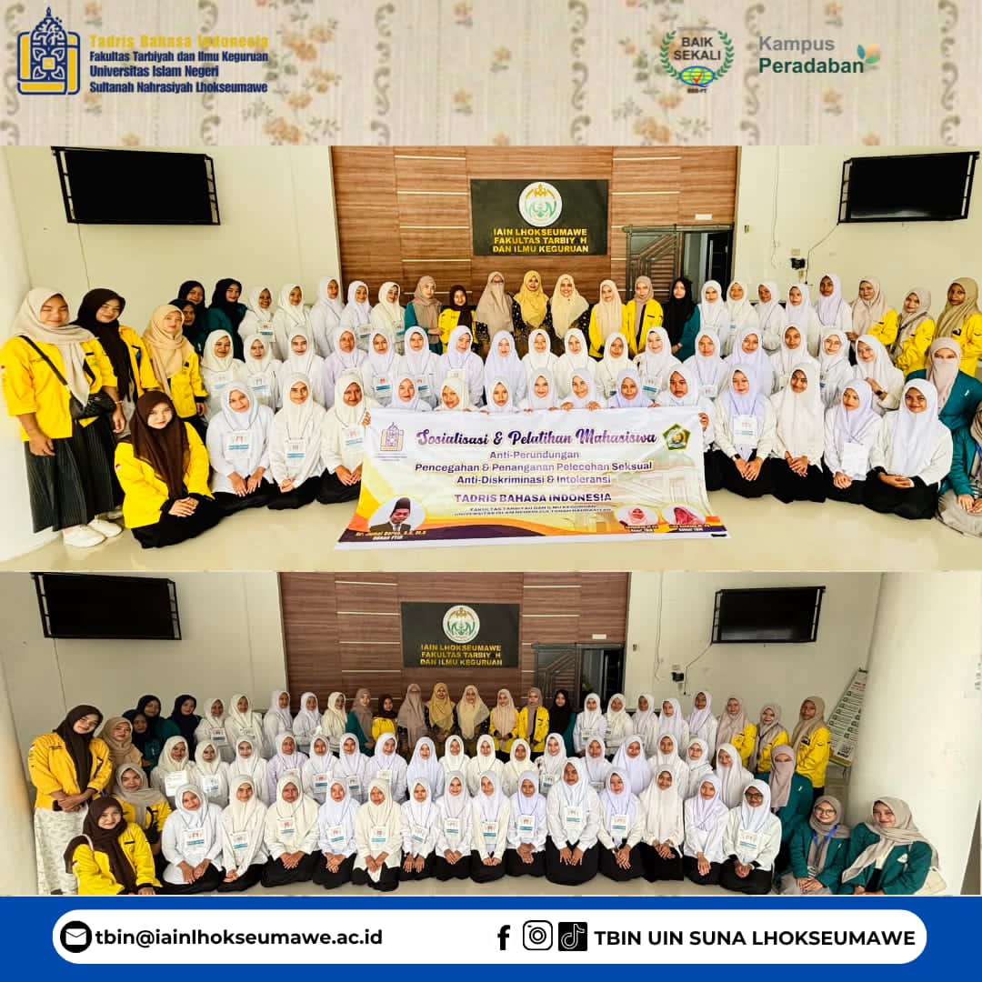 Lhokseumawe – Dalam rangkaian PBAK 2025, Jurusan Tadris Bahasa Indonesia (TBIN) FTIK UIN Sultanah Nahrasiyah Lhokseumawe menyelenggarakan Sosialisasi dan Pelatihan Anti-Perundungan, Pencegahan dan Penanganan Pelecehan Seksual, serta Anti-Diskriminasi dan Intoleransi pada Jumat (29/8/2025). Kegiatan ini menjadi bagian penting dari rangkaian Pengenalan Budaya Akademik dan Kemahasiswaan (PBAK) dengan tujuan membekali mahasiswa baru agar memiliki kesadaran, sikap kritis, dan keberanian dalam menciptakan lingkungan kampus yang sehat, aman, serta bebas dari segala bentuk kekerasan.