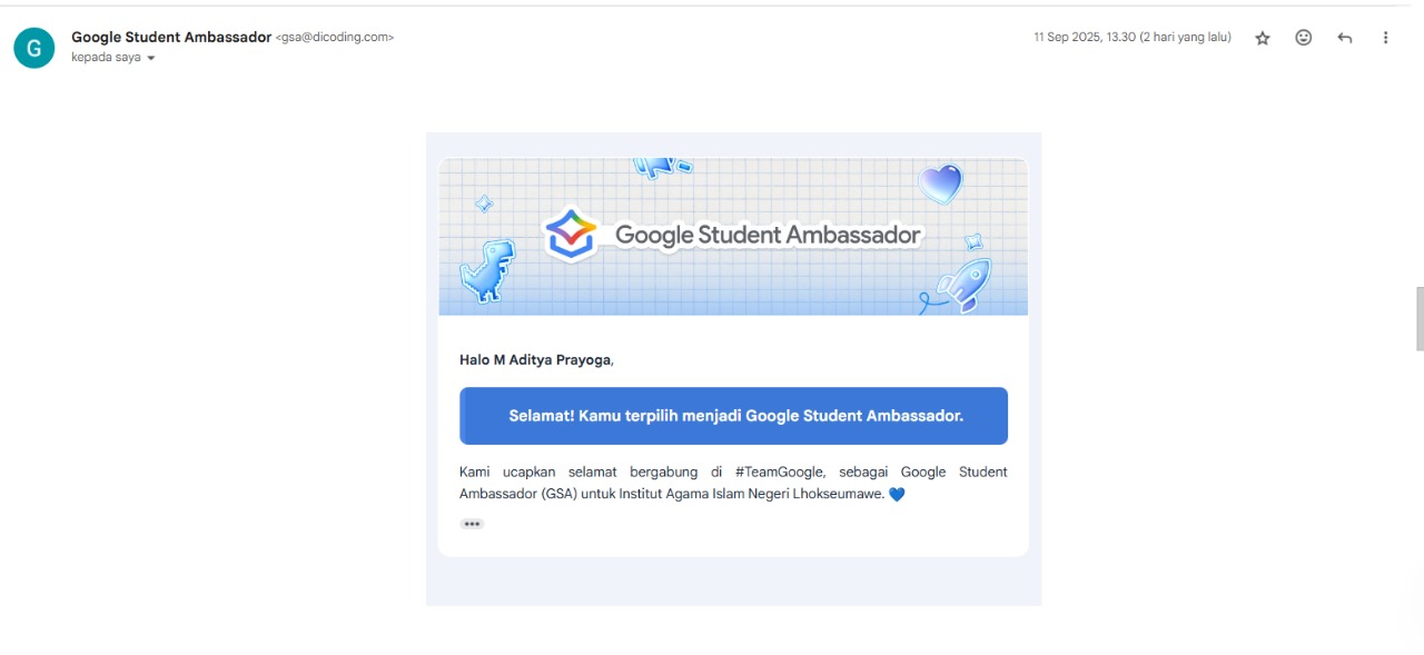 Lhokseumawe, 11 September 2025 — Civitas akademika Fakultas Tarbiyah dan Ilmu Keguruan (FTIK) UIN Sultanah Nahrasiyah merasa bangga atas prestasi yang diraih oleh salah satu mahasiswanya, M. Aditya Prayoga. Mahasiswa Jurusan Manajemen Pendidikan Islam (MPI) ini secara resmi terpilih sebagai Google Student Ambassador (GSA) tahun 2025, menjadikannya satu-satunya perwakilan dari FTIK.
